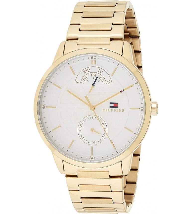 Experience timeless elegance and sophistication with the Tommy Hilfiger Hunter watch for men. The white dial and gold steel strap exude luxury while providing durability and comfort. Perfect for any occasion, this watch is a statement of impeccable style.