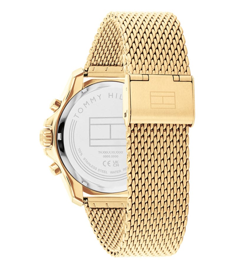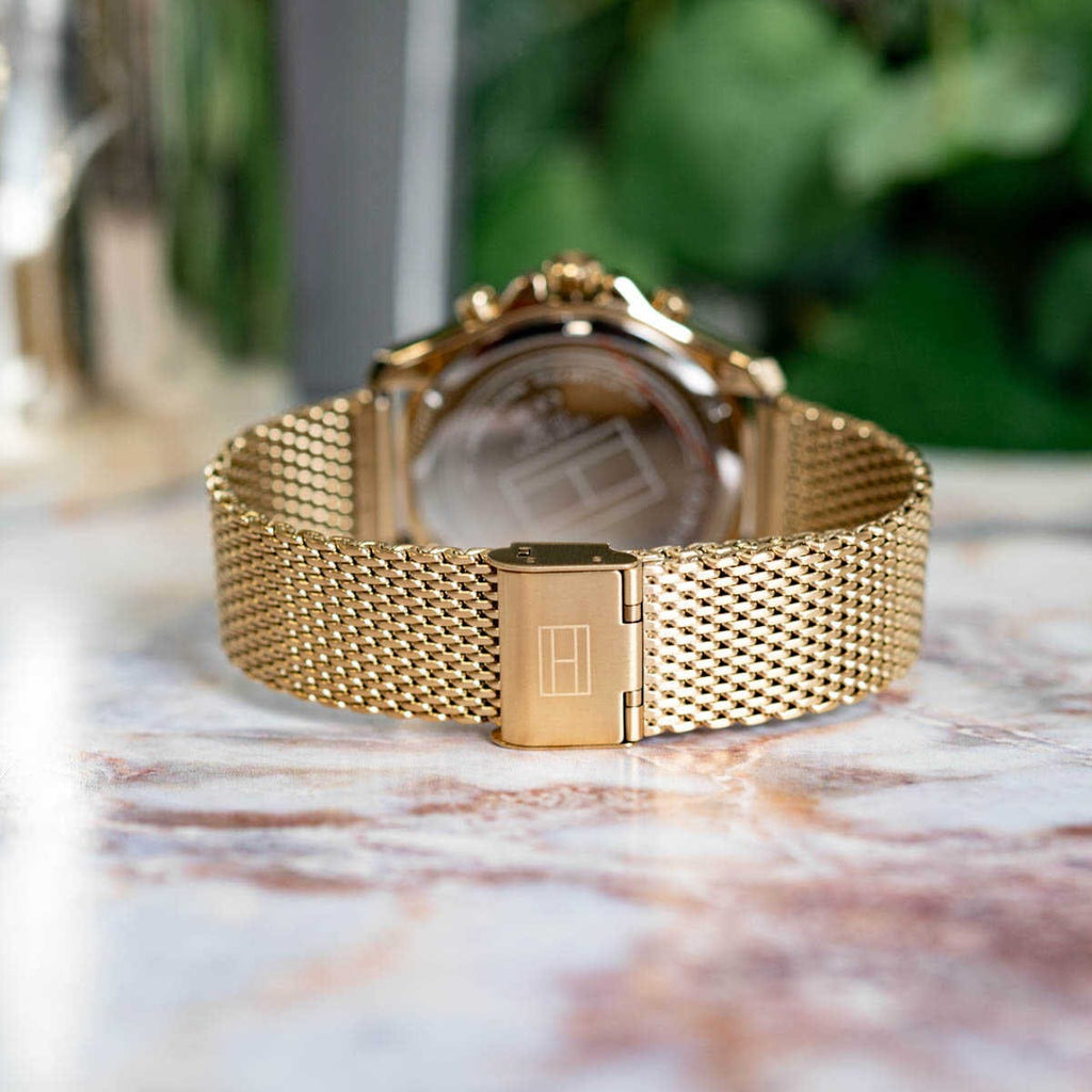 Elevate your style with the Tommy Hilfiger Jordan Chronograph Watch. Featuring a vibrant green dial and a sleek gold mesh strap, this watch exudes sophistication. The chronograph function allows you to keep track of time with precision. Perfect for any occasion, this watch is a must-have for the modern man.