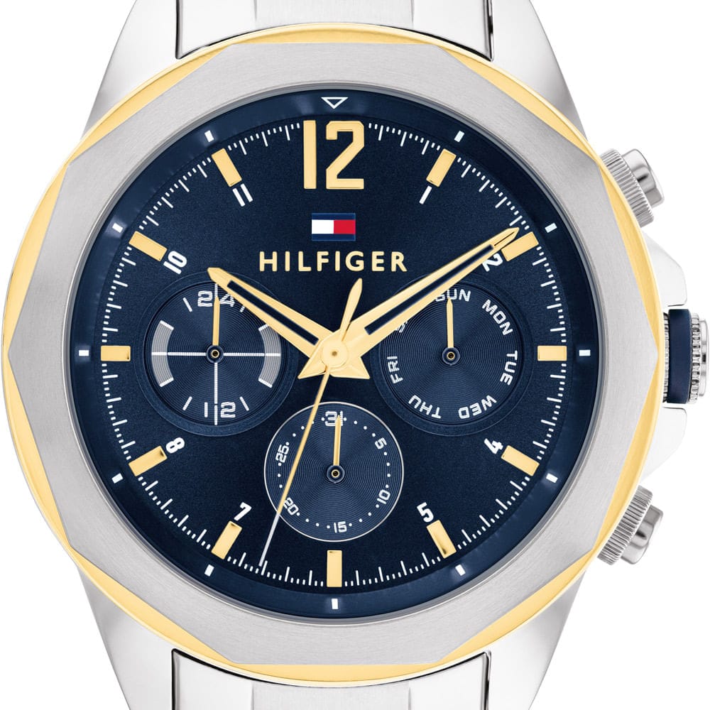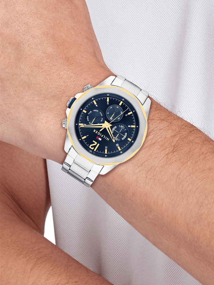 Power up with this Quartz Multi-function Tommy Hilfiger watch! A 46mm diameter case and 11.5mm thickness tops off its Navy Dial and 22mm wide Stainless Steel Strap, secured with a Push Bottom Buckle. Stroll through a rainy day and stay 5A Water Resistant.
