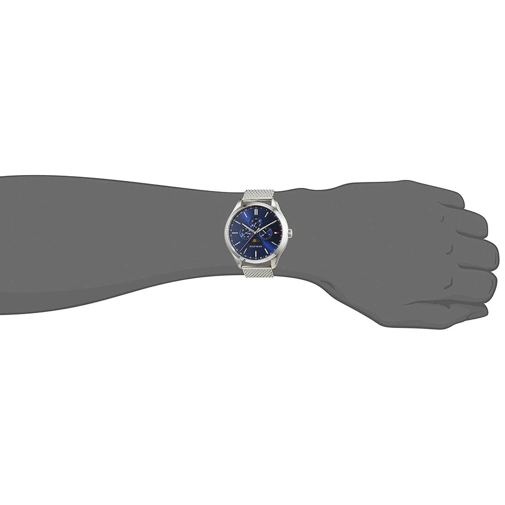 The case diameter is 43 mm, and the thickness is 10 mm. The Tommy Hilfiger 1791302 watch has a stainless steel bracelet and analog dial, covered by a mineral crystal glass. Water resistant to a depth of 30 m (3 atm), the watch has the following functions: hour, minute, second.