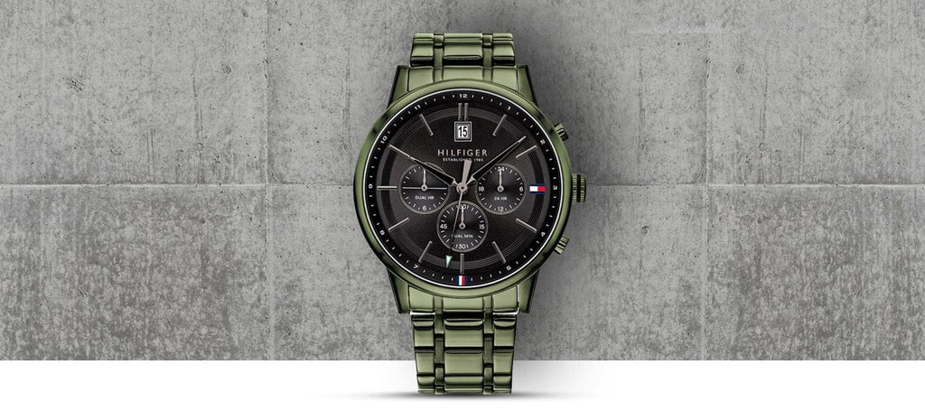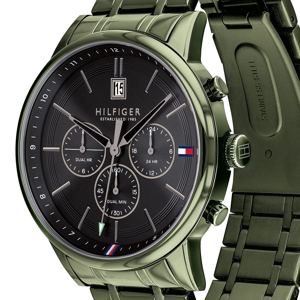 From the Tommy Hilfiger men's collection, this watch boasts a classic design, being both functional and fashionable. To always keep you on track, this timepiece features a date function at 12 o'clock, as well as a dual time zone sub dial for those frequent travellers. Its design is refined, with a colour palette of classic black and olive green, and the distinctive Tommy Hilfiger branding at 3 o'clock.