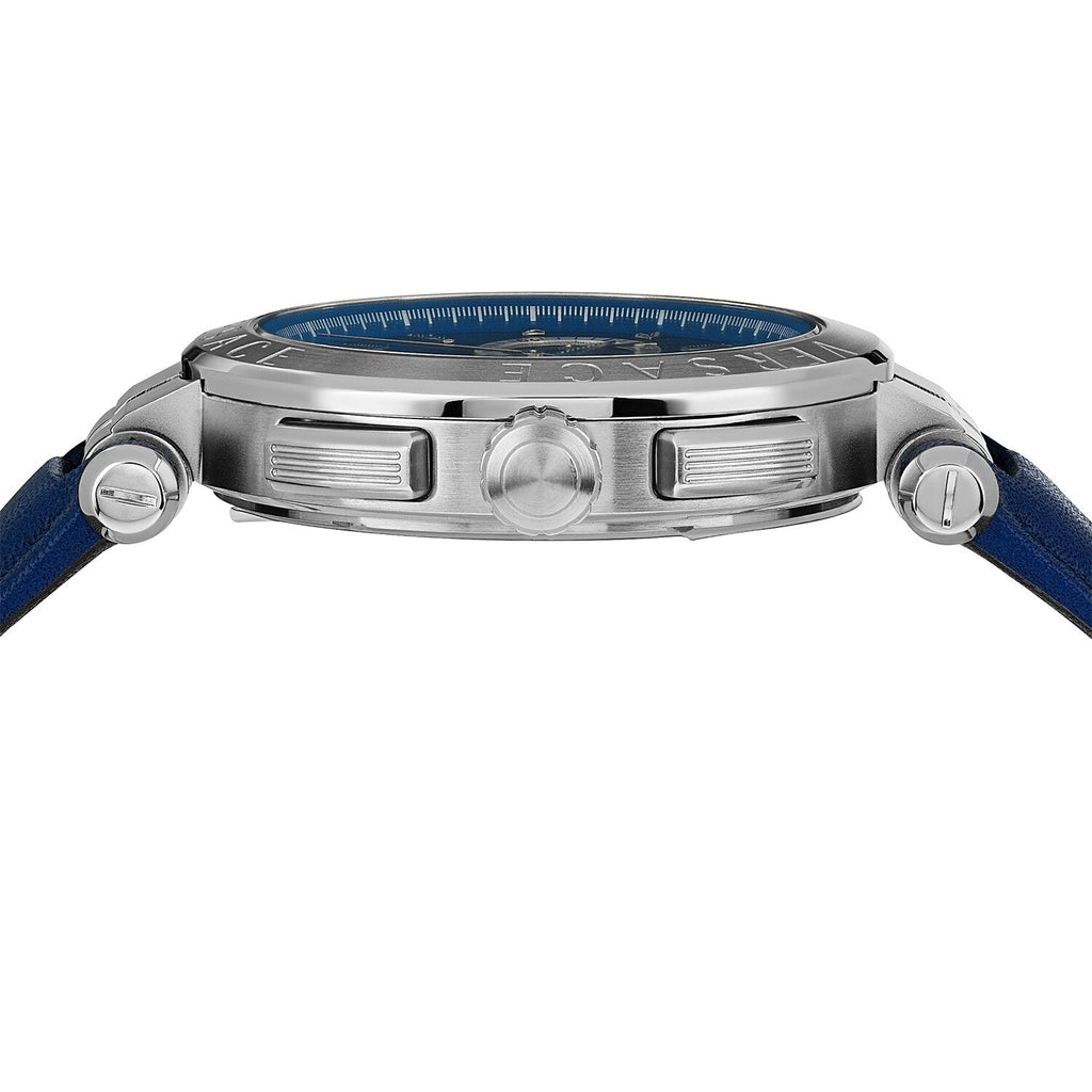 Experience luxury and style with the Versace Aion Chronograph Watch. With a bold blue dial and matching leather strap, this watch is sure to elevate any outfit. The precision chronograph feature is perfect for keeping up with your busy schedule. Make a statement and be on time, always with Versace.