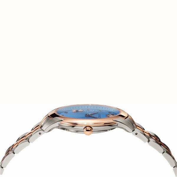 Silver-tone stainless steel case with a two-tone (silver-tone and rose gold-tone) stainless steel bracelet. Fixed rose gold-tone stainless steel bezel. Blue dial with rose gold-tone hands and index hour markers. Minute markers around the outer rim. Dial Type: Analog. Quartz movement. Scratch resistant sapphire crystal. Pull / push crown. Solid case back. Round case shape, case size: 38 mm, case thickness: 8 mm. Band width: 18 mm. Folding clasp. Water resistant at 30 meters / 100 feet. Functions: hour, minute. Dress watch style. Watch label: Swiss Made. Versace Audrey Quartz Blue Dial Ladies Watch VELR00619.