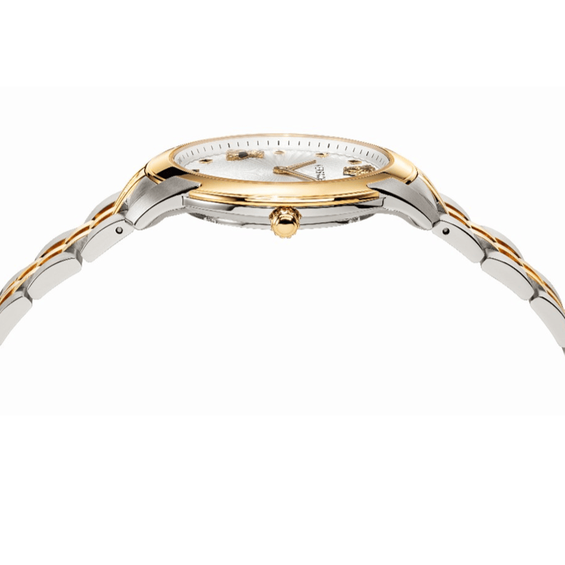 Silver-tone stainless steel case with a two-tone (silver-tone and gold-tone) stainless steel bracelet. Fixed gold-tone stainless steel bezel. Silver-tone dial with gold-tone hands and index hour markers. Minute markers around the outer rim. Dial Type: Analog. Quartz movement. Scratch resistant sapphire crystal. Pull / push crown. Solid case back. Round case shape, case size: 38 mm, case thickness: 8. Band width: 18. Folding clasp. Water resistant at 30 meters / 100 feet. Functions: hour, minute. Dress watch style. Watch label: Swiss Made. Versace Audrey Quartz Silver Dial Ladies Watch VELR00519.