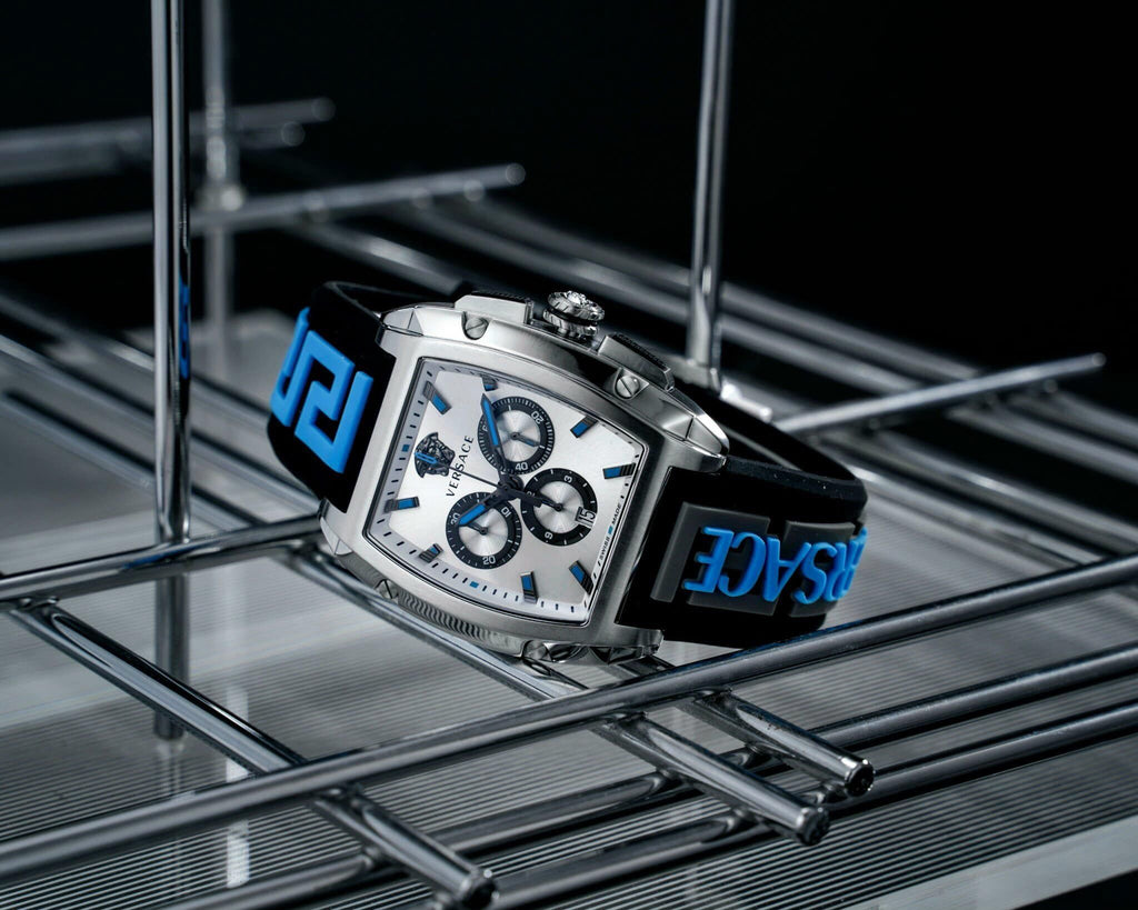 Following the latest trends, Versace Dominus embodies the Versace DNA in this bold tonneau case body. The watch hosts a chrono movement with 3 counters. The silicone strap features a Versace logo that meets the Greca creating a new masculine and eye-catching pattern.