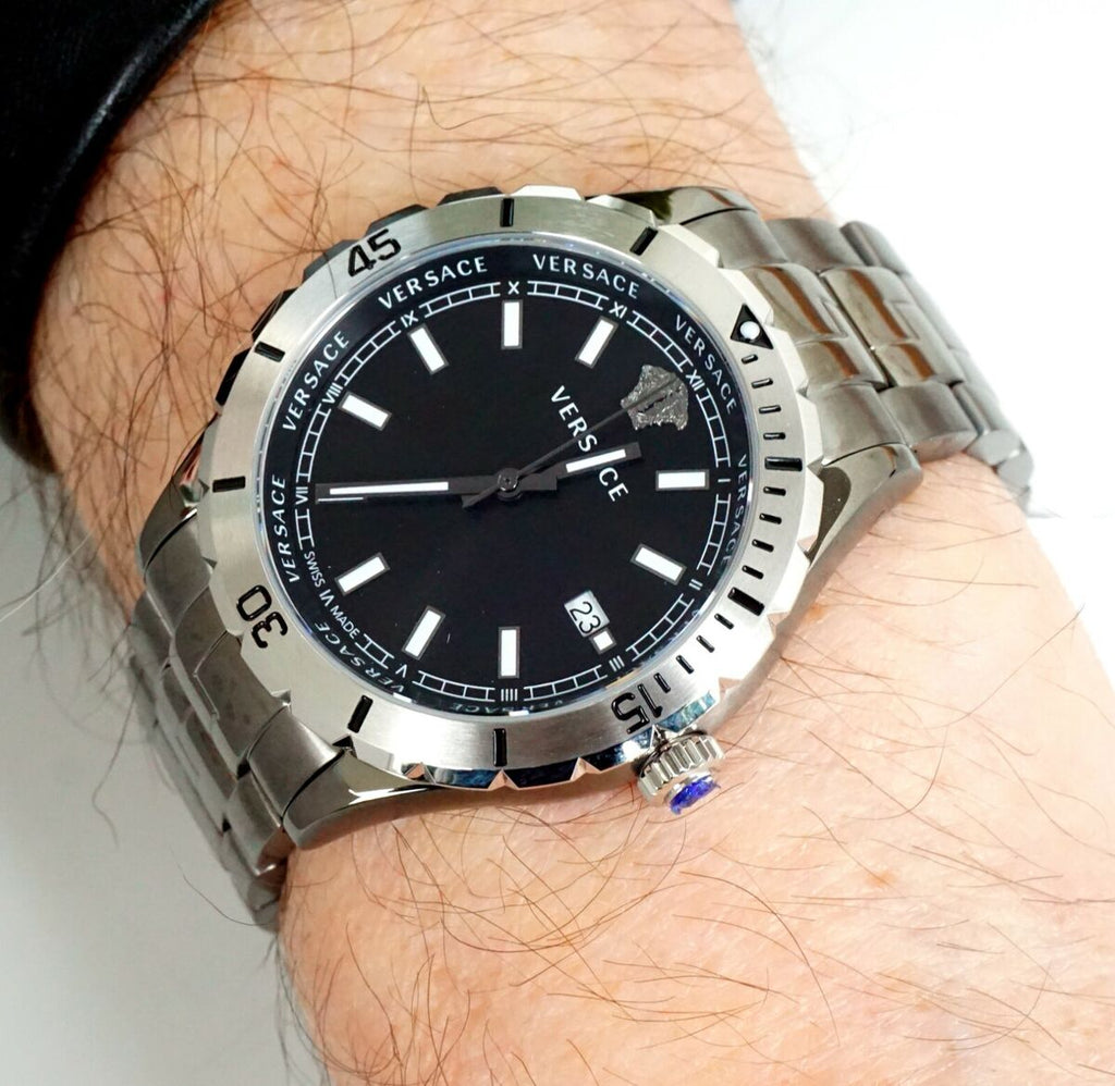 At the heart of this timepiece is an quartz movement (with battery) that, as is usual for Versace watches, guarantees precise timekeeping and provides the following functions: date, minute, second, hour.