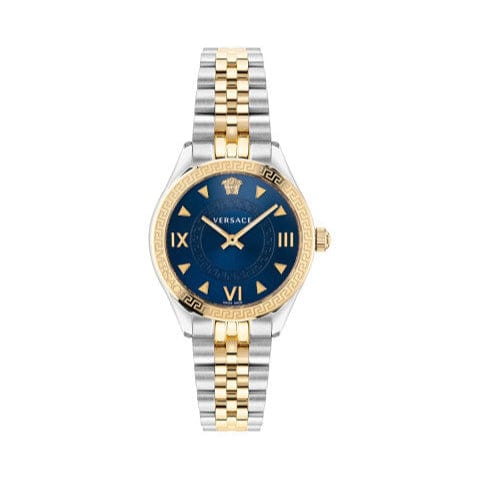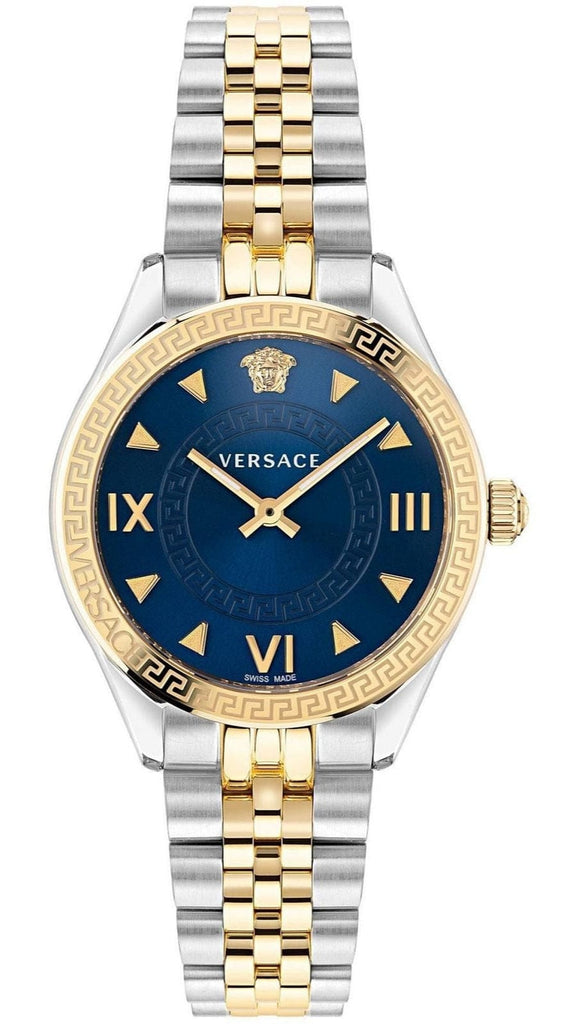 Elevate your style with the Versace Hellenyium Quartz watch, designed exclusively for women. Featuring a striking blue dial and a sophisticated two-tone steel strap, this timepiece combines luxury with durability. Its precise quartz movement ensures reliable timekeeping, while the elegant design complements both casual and formal looks. Make a statement of timeless elegance and refined taste with this exquisite Versace watch.