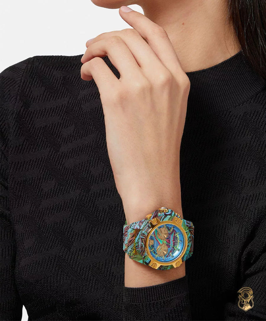 Plays of transparency and color, material and camouflage pattern, form a continuum on the dial and strap too, reinstating the Greca as an original and sophisticated detail. This seemingly broken yet uninterrupted line, reinterpreted by Versace through a contemporary lens, forms the metal loop on the strap and can also be seen on the inner ring inside the case. Where we find a 3D Medusa head at 12 o’clock and the Versace logo, repeated in bigger characters on the top ring at 6 and 12 o’clock.