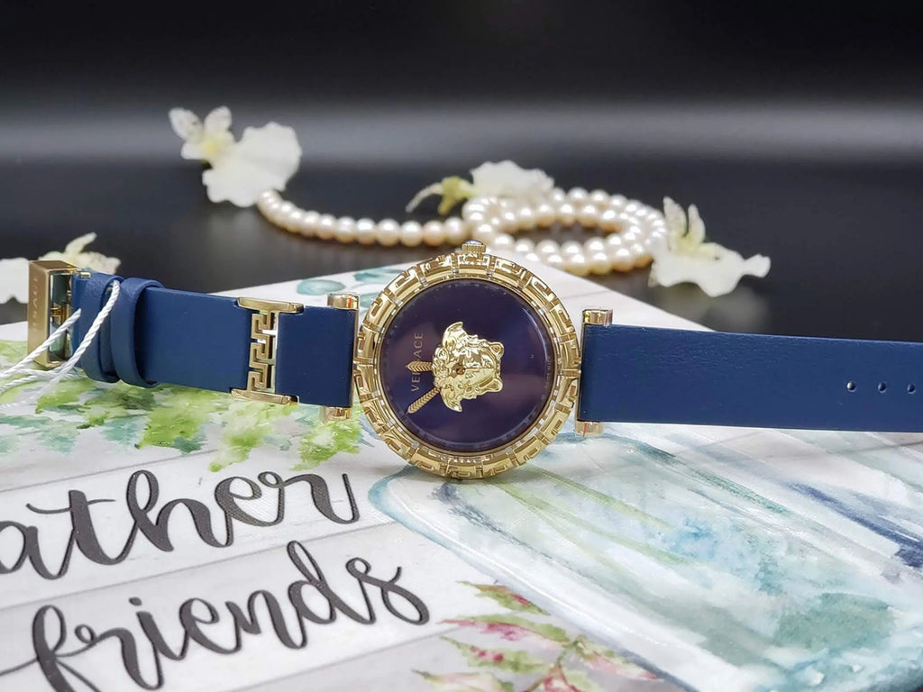 Yellow gold ion-plated stainless steel case with a blue leather strap. Fixed (greca pattern) yellow gold ion-plated bezel. Blue dial with yellow gold-tone hands. No markers. Dial Type: Analog. Quartz movement. Scratch resistant sapphire crystal. Pull / push crown. Solid case back. Round case shape. Case size: 37 mm. Case thickness: 10 mm. Band width: 18 mm. Deployment clasp with a push button release. Water resistant at 50 meters / 165 feet. Functions: hour, minute. Palazzo Empire Greca Series. Casual watch style. Watch label: Swiss Made. Versace Palazzo Empire Greca Quartz Blue Dial Ladies Watch VEDV00219.