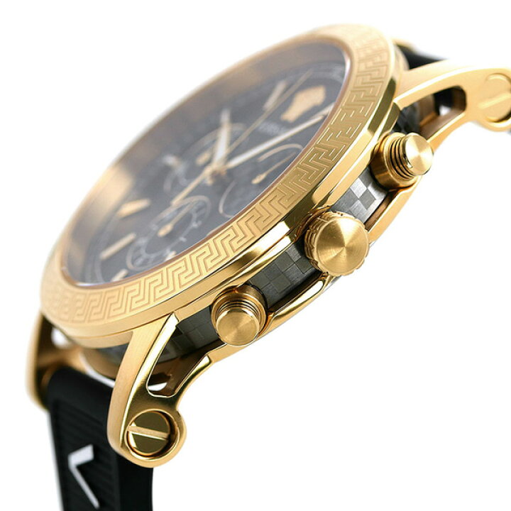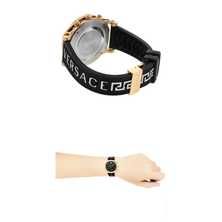 Black Dial. Gold Plated Hour Markers, Luminous Hands. IP Gold Sub-Dials with a 12 Hour counter at 6 O'Clock, 30 Minute Counter at 9 O'Clock and Green Small Seconds at 3 O'Clock. Date Window at 4 O'Clock. IP Gold Medusa Head at 12 O'Clock