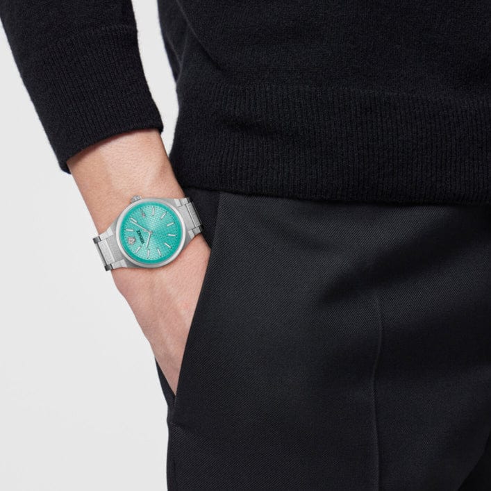 Timeless, elegant but still iconic, this is the new V-Auria. A case that embraces a guillochè dial with the date window at 3h. The greca in the inner ring, the medusa head, Versace logo at 12 and the greca details engraved along the bracelet are several symbols that recall the Versace brand DNA.