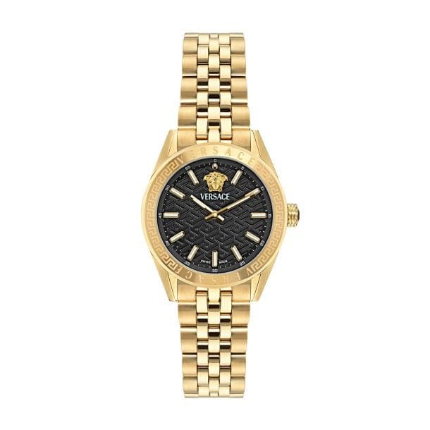 This timeless case body features a sleek dial enriched with Versace la Greca pattern and a 3D Medusa at 12h. The detailed top ring gives to this watch a glamourous look & feel enriched with Versace logo at 12h. The 36mm case is enriched with a 3 hands movement.
