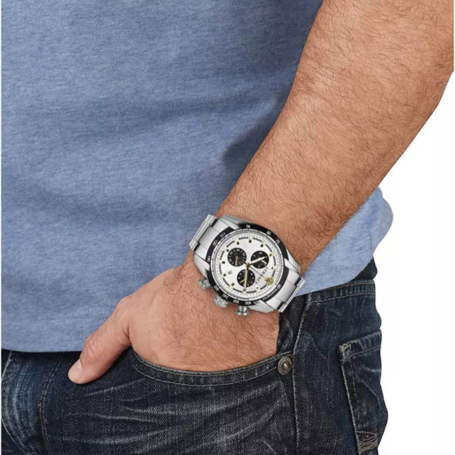 Featuring Versace Men's Bracelet Swiss Watch, model V-Ray VE2I00321. This is a stunning timepiece that exudes luxury and style. The watch features a 44mm round stainless steel case with a polished finish, and a silver dial with stick indexes and luminous hands. The watch also has a date indicator, a chronograph, and is water-resistant up to 200 meters.