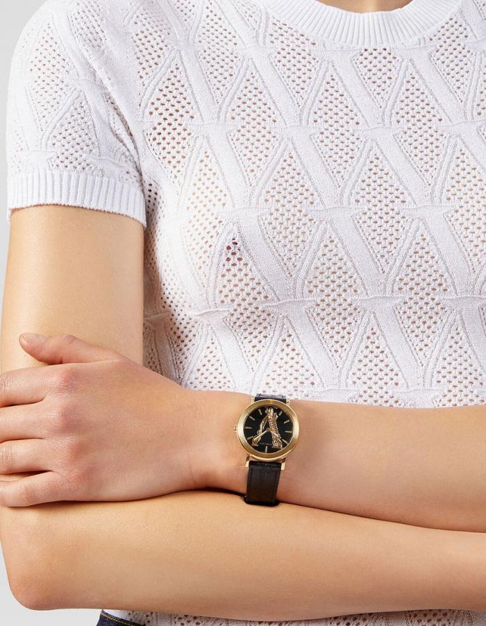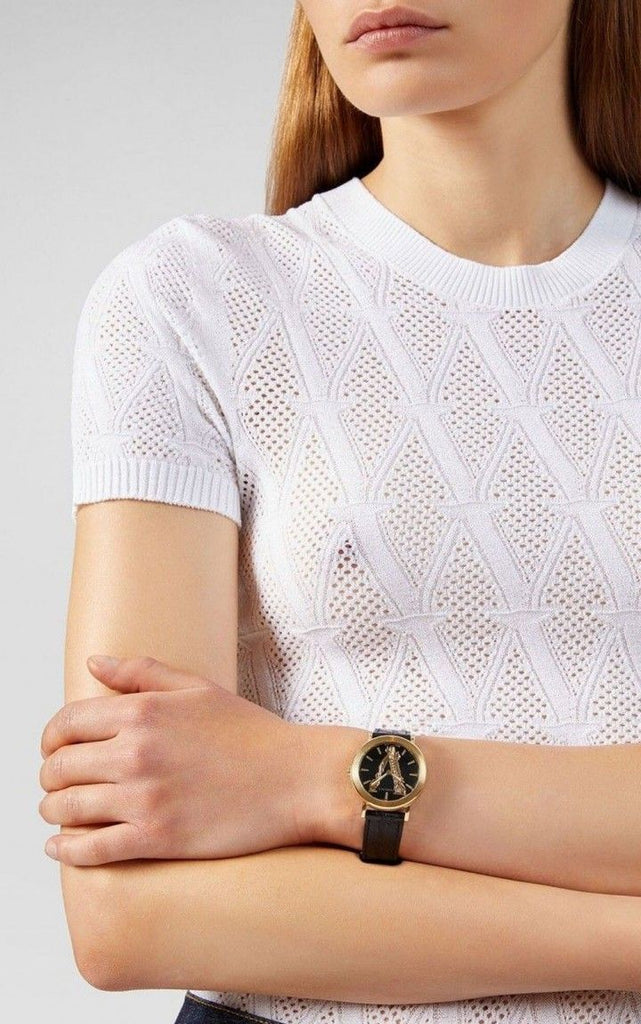 Yellow gold-tone stainless steel case with a black (calfskin) leather strap. Fixed yellow gold-tone bezel. Black (Barocco V) dial with yellow gold-tone hands and index hour markers. Dial Type: Analog. Quartz movement. Scratch resistant sapphire crystal. Pull / push crown. Solid case back. Round case shape. Case size: 36 mm. Case thickness: 8.5 mm. Band width: 18 mm. Butterfly clasp. Water resistant at 50 meters / 165 feet. Functions: hour, minute. Virtus Series. Dress watch style. Watch label: Swiss Made. Versace Virtus Quartz Black Dial Black Leather Ladies Watch VEHC00119.