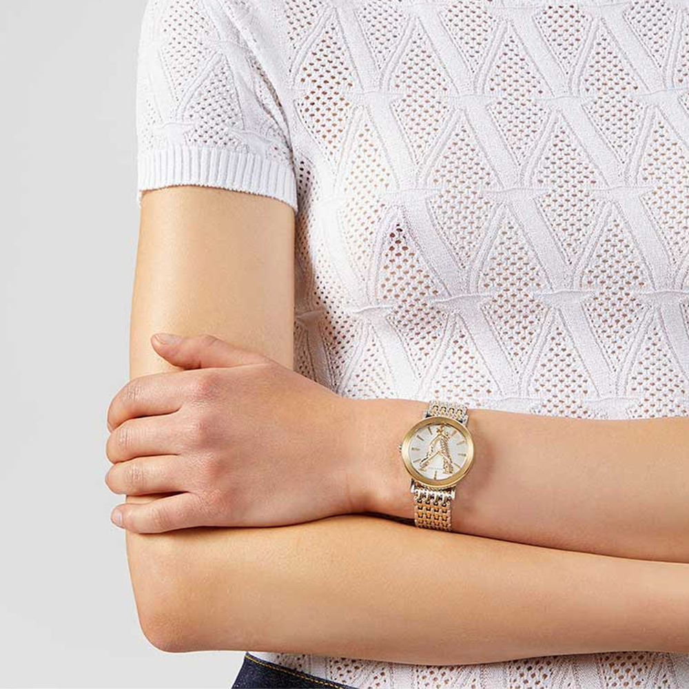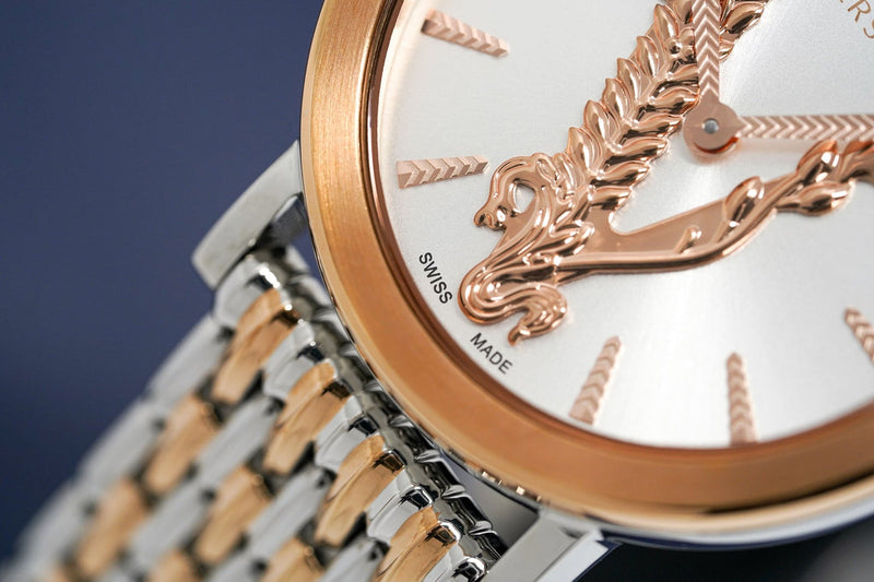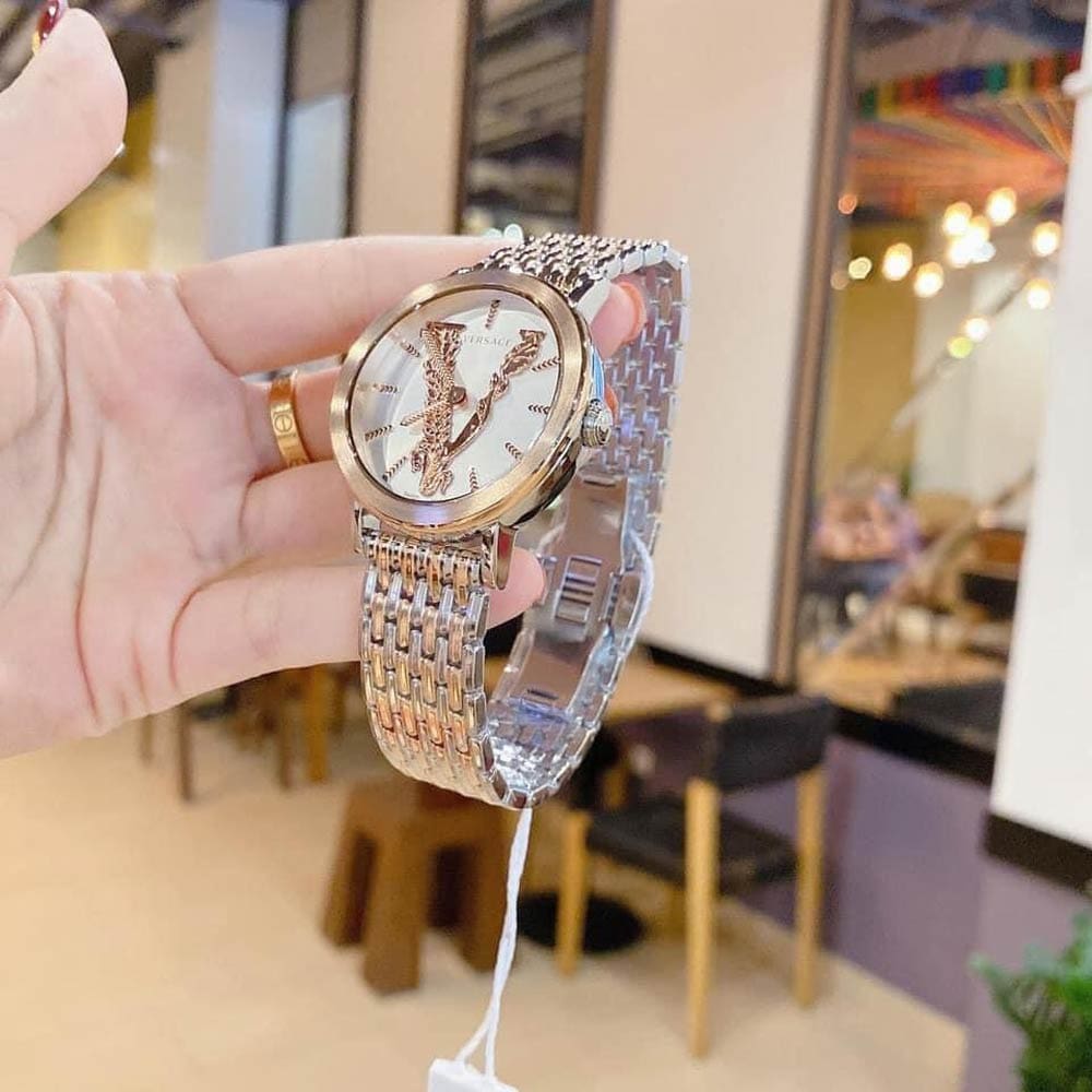 - The Versace Virtus VEHC00519 Women’s Only Time Watch is part of the Virtus Collection. It has a white dial with an accent of rose gold design. Moreover, it has a beautiful stainless steel two-tone strap of silver and rose gold color.